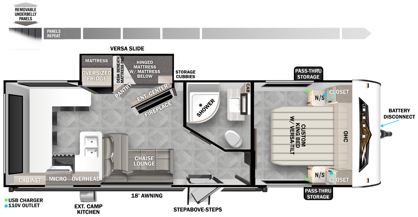 Versa-Tilt Bed, 200W Solar Panel w/30 Amp Controller, Stow N Go Storage, Chaise Lounge, MORryde™StepAbove Double Step, Exterior LED Light Strip Under Awning, Modern Cloth Roller Shades w/ AutoStop, Green Pkg: Roof Mount Solar Prep & LED Mushroom Lights ,Power Awning w/ Adjustable Legs, Quick Drop Stabilizer Jacks, Power Tongue Jack w/ LED Light, Stainless Steel Roll Up Sink Cover, Ext. Convenience PKG: Friction Hinge & Baggage Door Magnets, Furrion Backup Camera Prep, 11 CU FT Frost-Free Refrigerator (12-volt), Slide-Out Awning Prep, Black Tank Flush, Solid Surface Countertops, Designated CPAP Storage, and Ext. Camp Kitchen